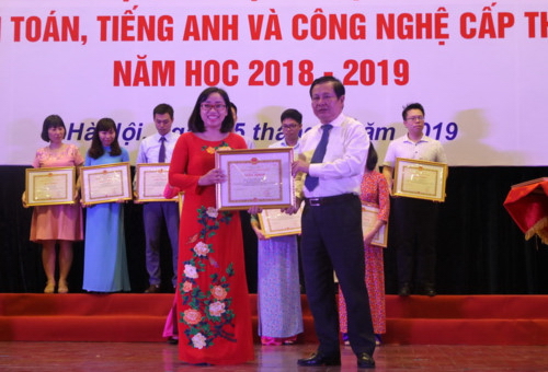 Ông Lê Ngọc Quang- Phó Giám đốc Sở GD&ĐT Hà Nội trao bằng khen cho cô giáo Nguyễn Thị Thanh Loan, Trường THPT Cao Bá Quát – Gia Lâm, đoạt giải Nhất môn Tiếng Anh cấp THPT